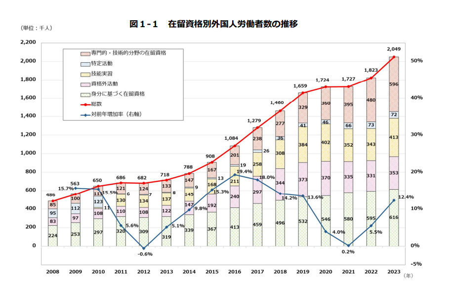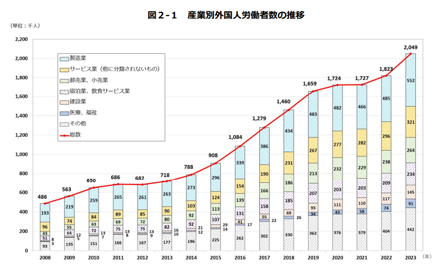 外国人労働者の実態について、調べてみましょう。2023年10月末時点で、外国人労働者数は初めて200万人の大台を突破し、過去最高を更新しました。外国人を雇用する事業所数も過去最高の318,775所となり、前年比6.7%の増加を記録しています。外国人労働者は、もはや一時的な補完労働力ではなく、日本経済を構造的に支える不可欠な存在へと変貌を遂げたことを明確に示している。