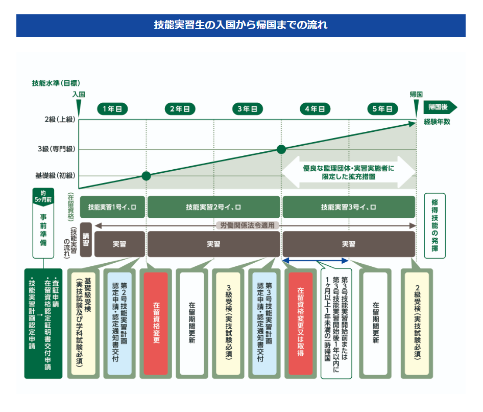 技能実習は1号(1年目)、2号(2・3年目)、3号(4・5年目)と段階的に移行し、それぞれ移行するためには技能評価試験に合格する必要があります。農業、漁業、建設、食品製造など、定められた約90職種165作業が対象で、実習が目的のため、原則として転職は認められていません。